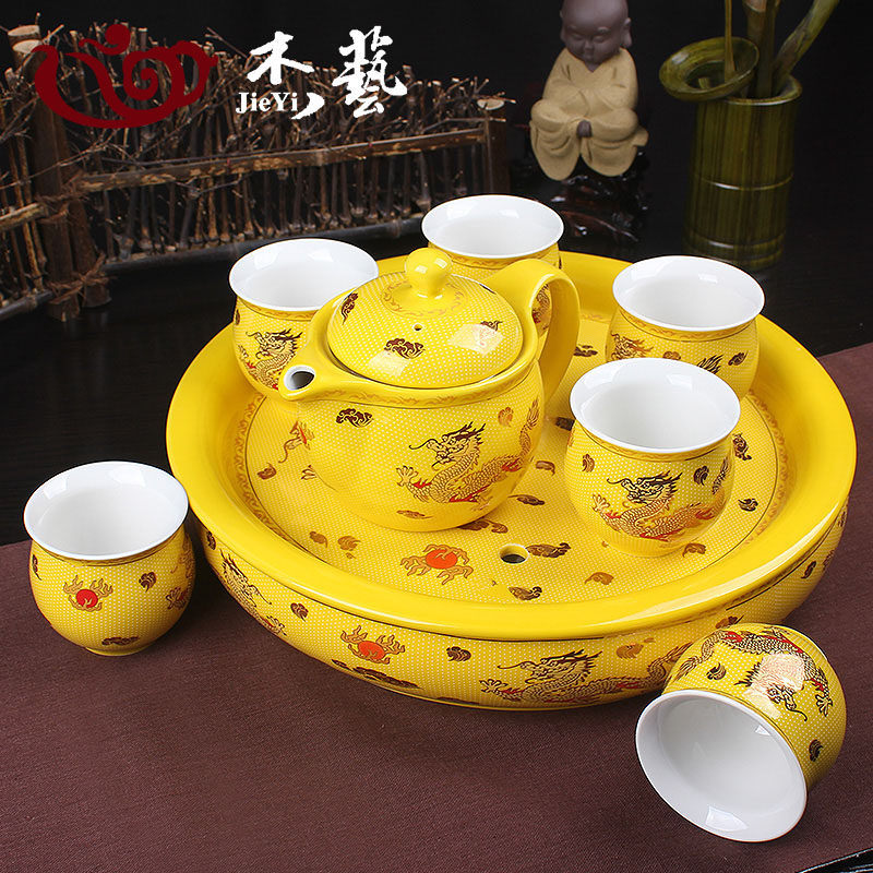 双11促销特价中国红龙凤功夫茶具套装家用黄色龙陶瓷茶杯整套茶盘