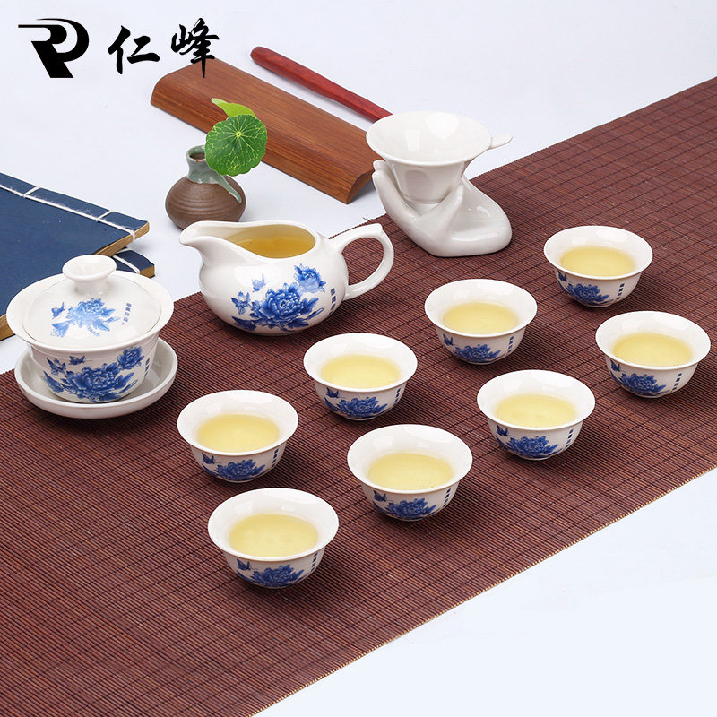 仁峰功夫茶具套装茶盘茶壶茶杯盖碗特价整套青花白瓷茶具办公家用