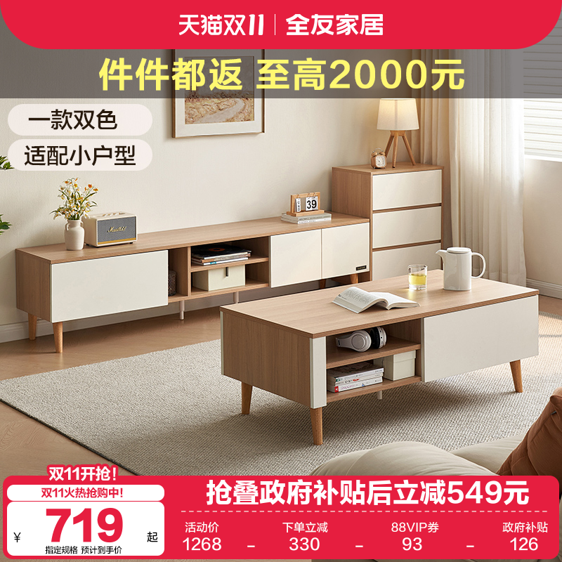 全友家居2025新款原木奶油风小户型客厅实木脚茶几电视柜组合家具