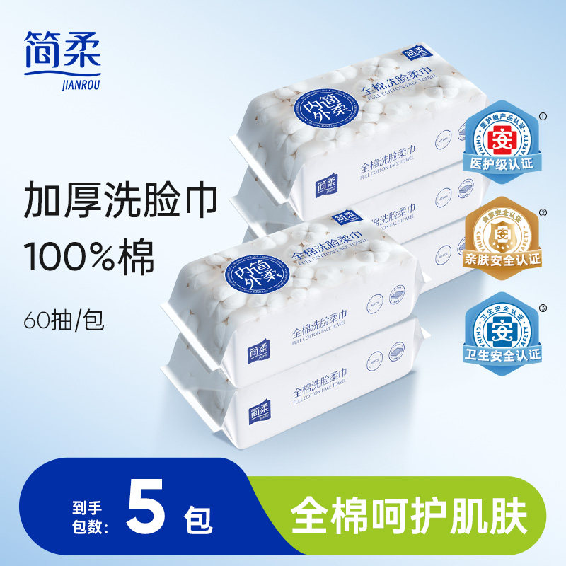 简柔全棉柔巾一次性洗脸巾纯棉洁面加厚擦脸巾抽取式 60抽*8包