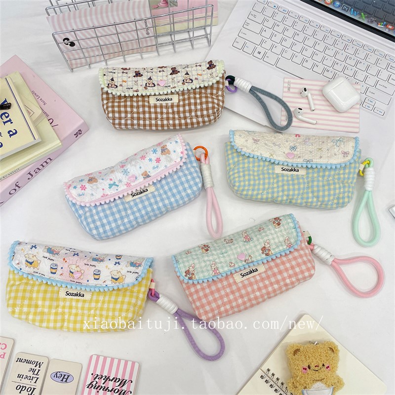 ins日系小众格子笔袋女大容量帆布大容量初高中学生文具盒收纳袋