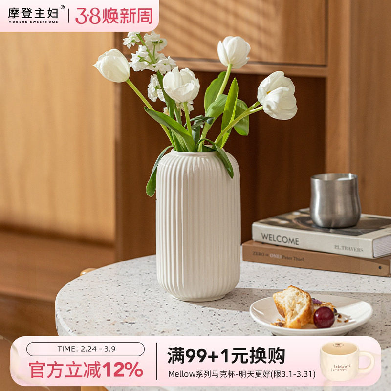 摩登主妇奶油风陶瓷花瓶简约家居桌面白色摆件客厅插花养鲜花装饰