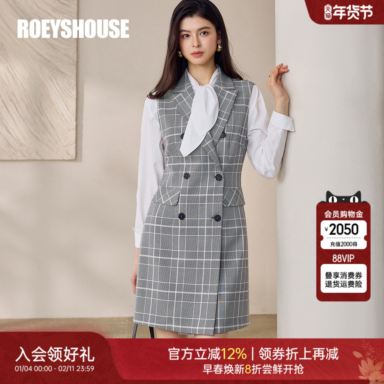 罗衣气质OL格子西装连衣裙女春季通勤干练双排扣修身无袖裙12738
