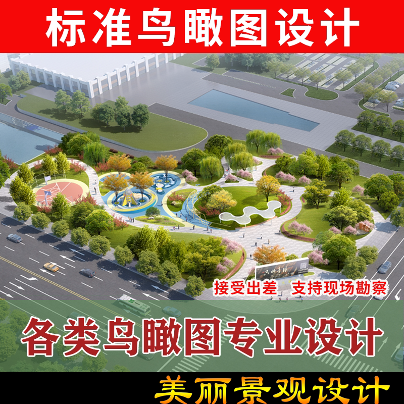 3d园林景观停车游乐场学校寺庙道路滨河鸟瞰图效果图方案设计制作