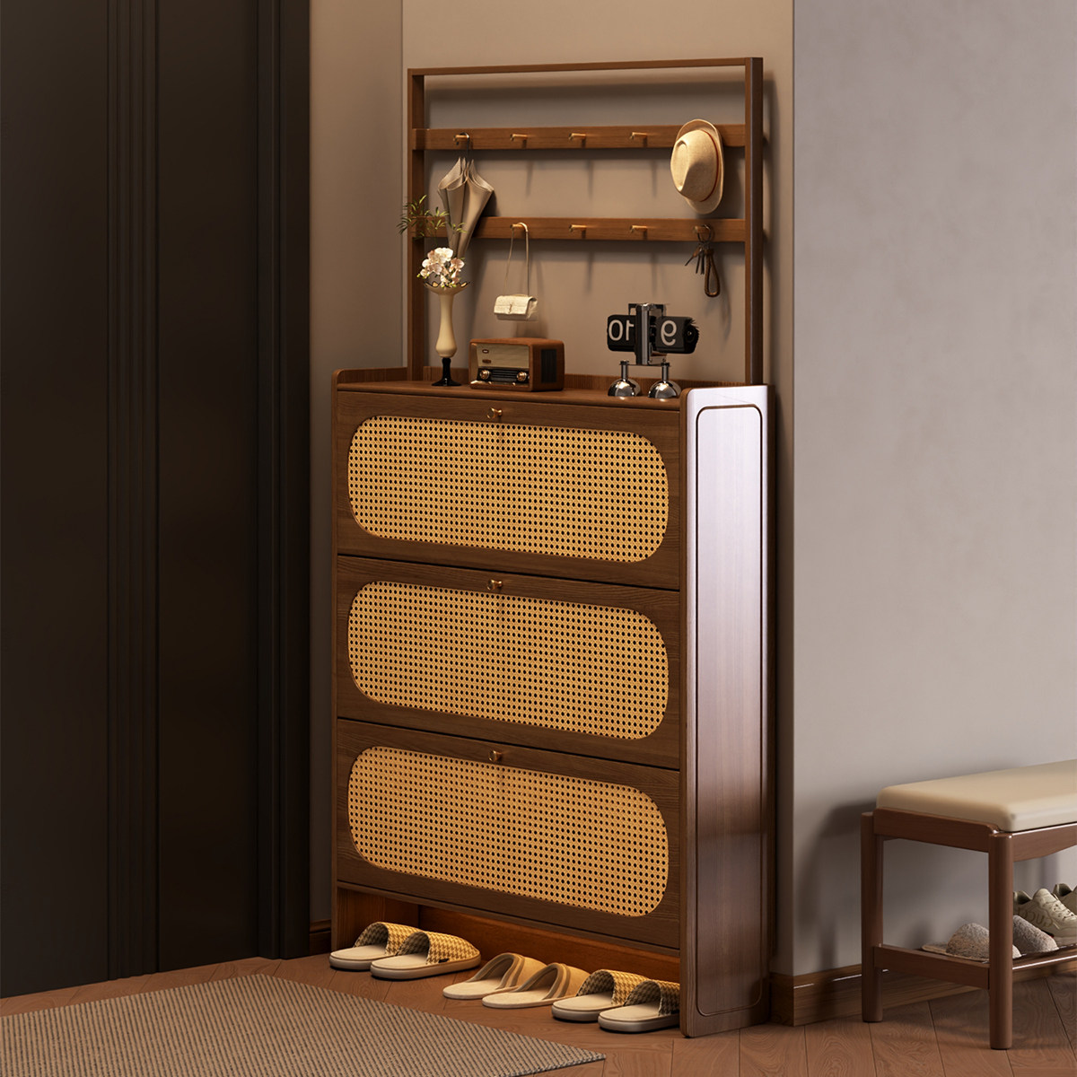 全实木鞋柜纯生态板藤编鞋柜超薄靠墙门口家用入户大容量鞋架收纳