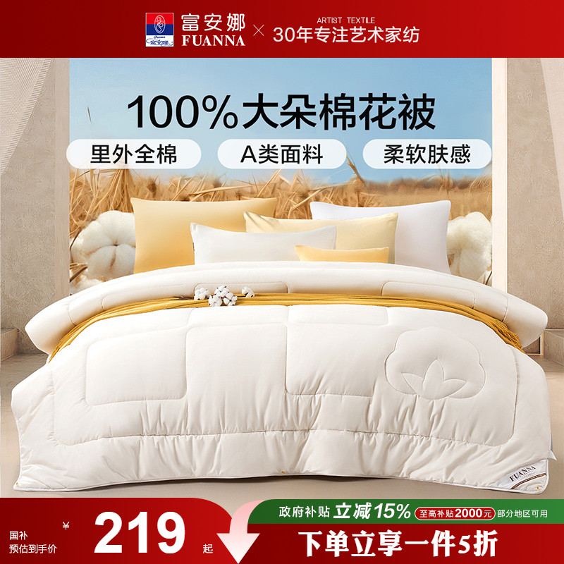 富安娜全棉100%棉花被子纯棉被褥棉被四季被宿舍被芯加厚被冬被