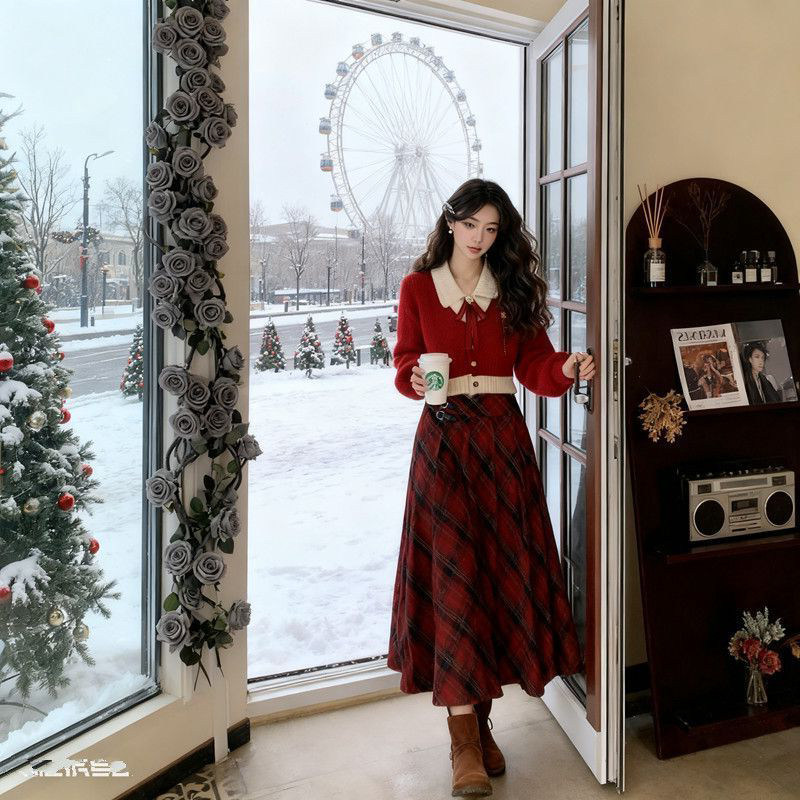 秋冬温柔小个子甜美感假两件红色毛衣开衫搭配格纹半身裙两件套装