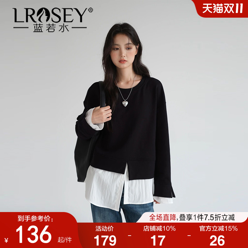 蓝若水大码女装假两件长袖卫衣胖MM秋季新款时尚不规则小众上衣