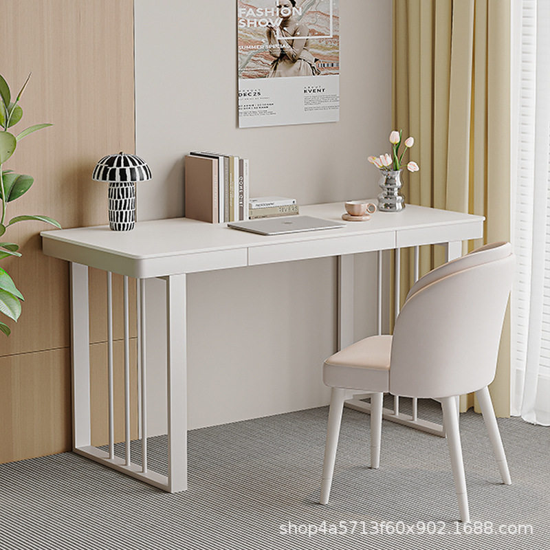 台式电脑桌奶油风纯白岩板书桌轻奢现代简约卧室家用办公桌椅组合