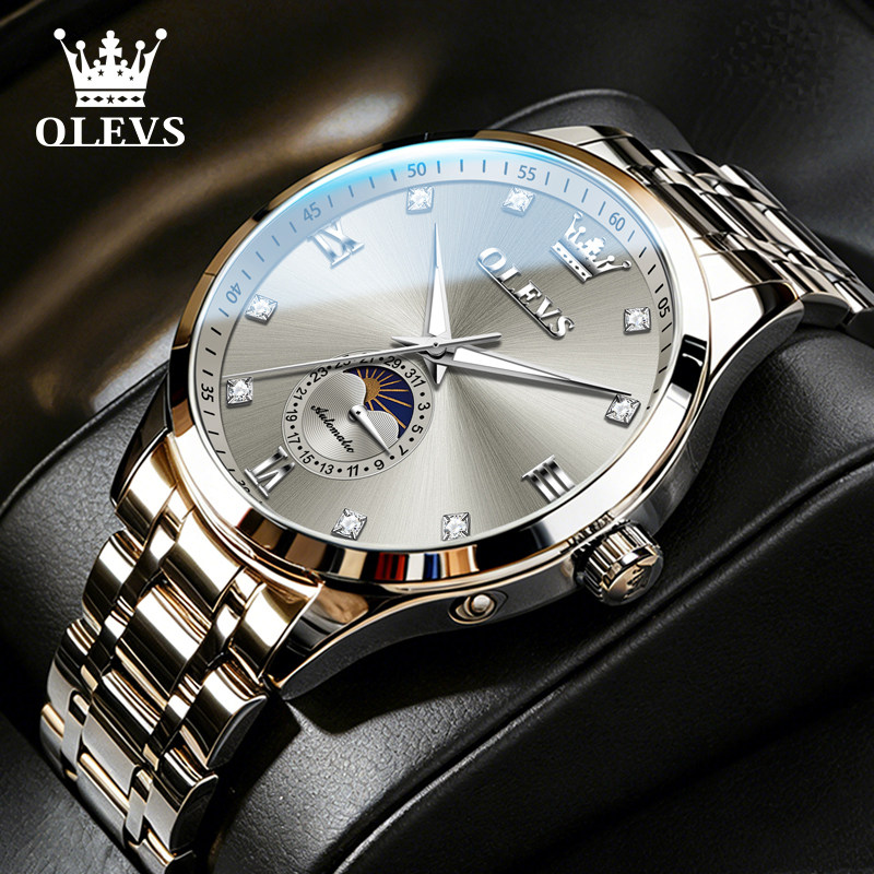 男士月相手表镶钻石英表钢带多功能计时腕表商务休闲潮流时尚男表