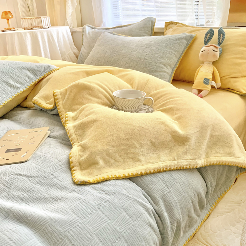 一默双拼牛奶绒床上四件套加厚加绒法兰绒珊瑚绒被套床单床上用品