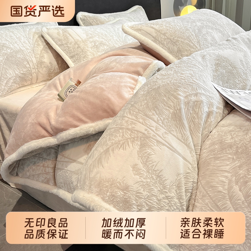 无印良品秋冬季雕花牛奶绒四件套轻奢加厚被套法兰珊瑚绒床上用品