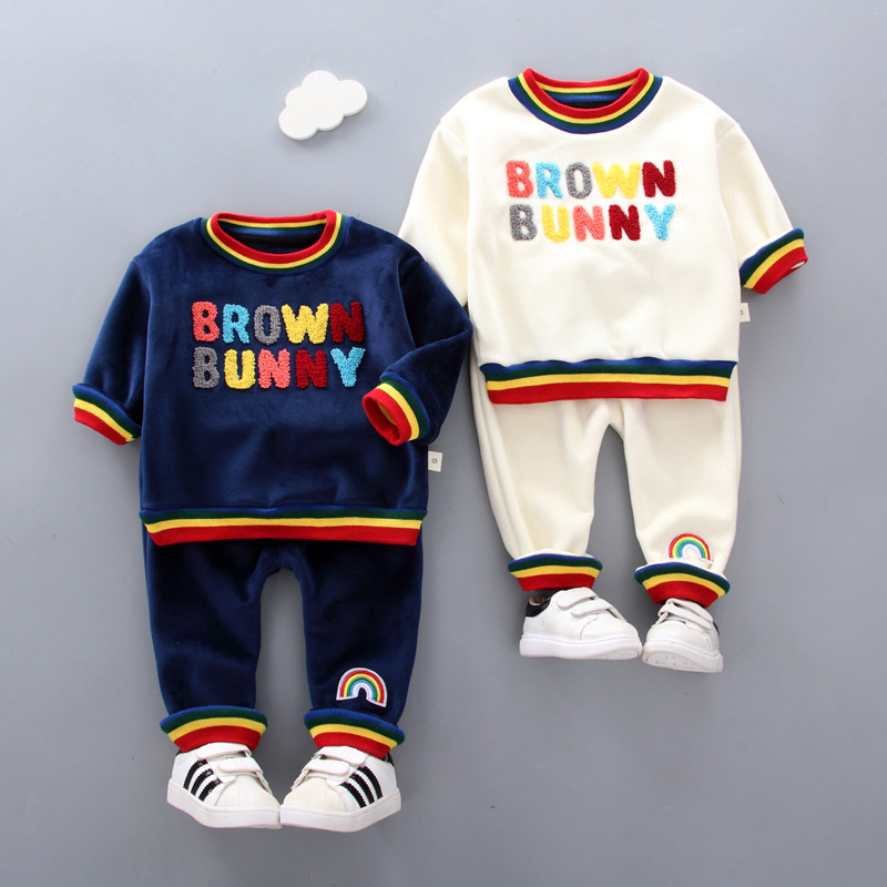 童装秋冬加绒套装男童女童金丝绒两件套儿童冬装宝宝卫衣加厚套装