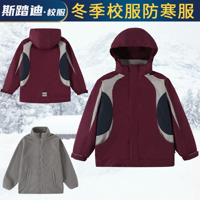 冬装小学生校服套装高中初中生冬季冲锋衣两件套枣红连帽拉链外套
