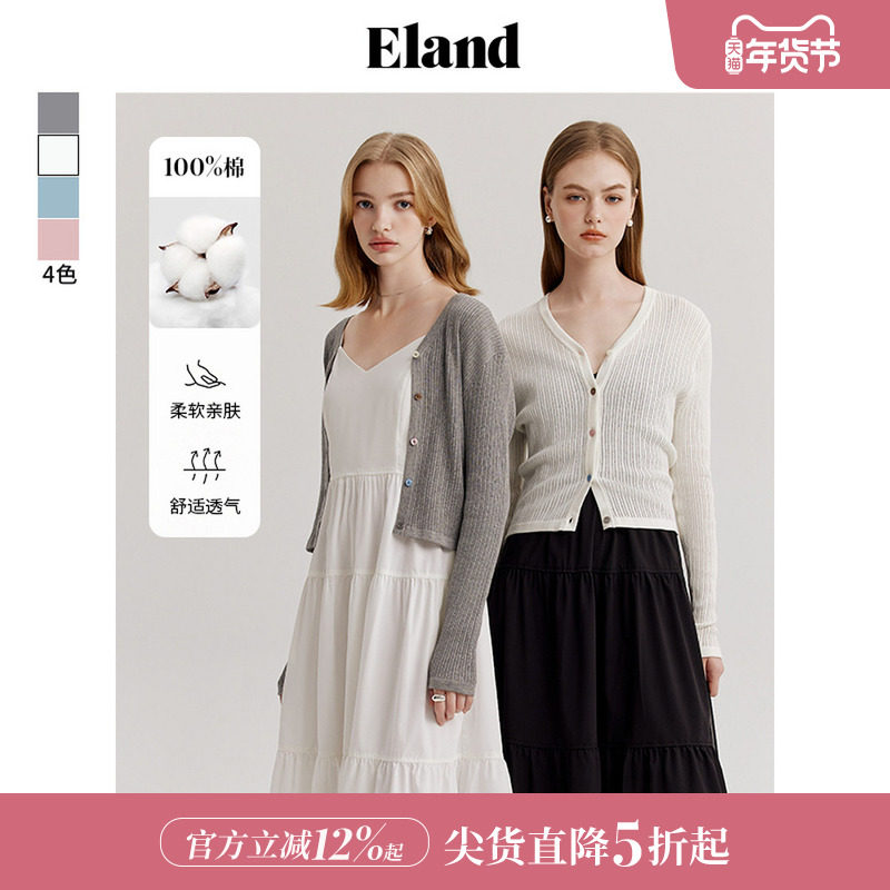 【100%棉】Eland衣恋微宽松V领针织开衫显瘦毛针织衫女夏
