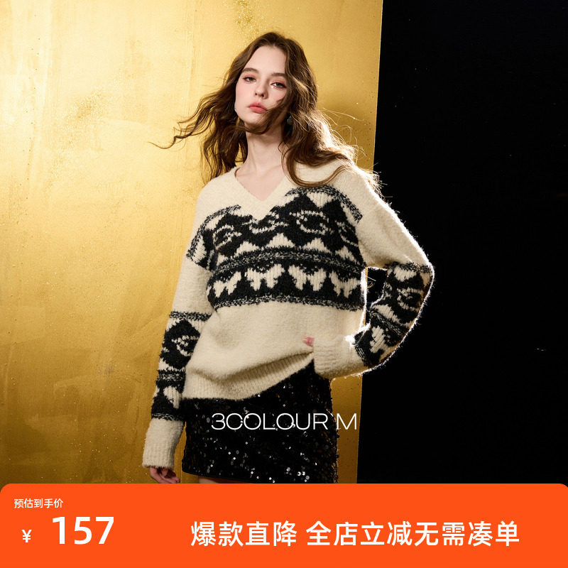 三彩2025冬季新款慵懒宽松V领针织衫长袖提花套头衫上衣显瘦百搭M
