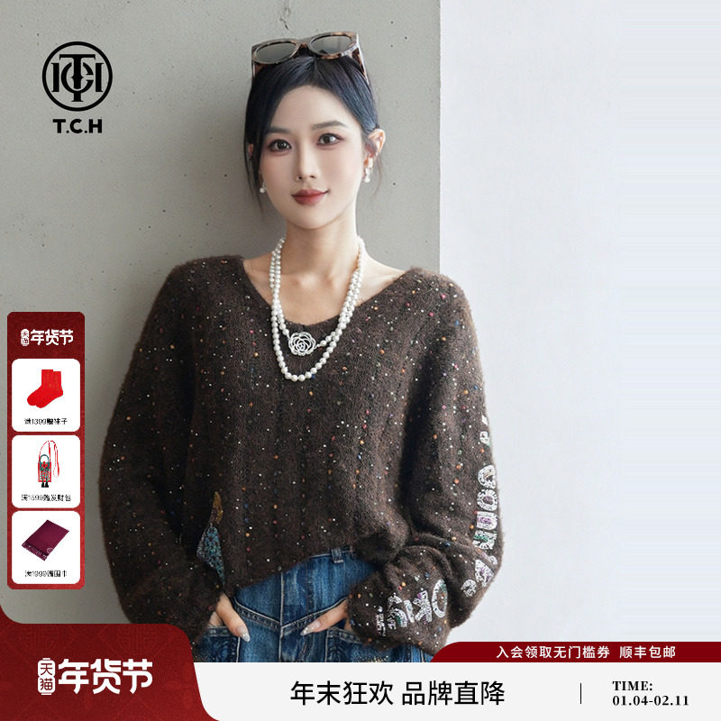 TCH枯树咖韵彩色点缀绵羊毛宽松V领针织衫女2025秋冬T75C09E5122