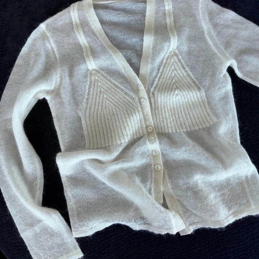 pusumede 复古收藏家 V领假两件针织开衫女宽松气质薄款外套上衣