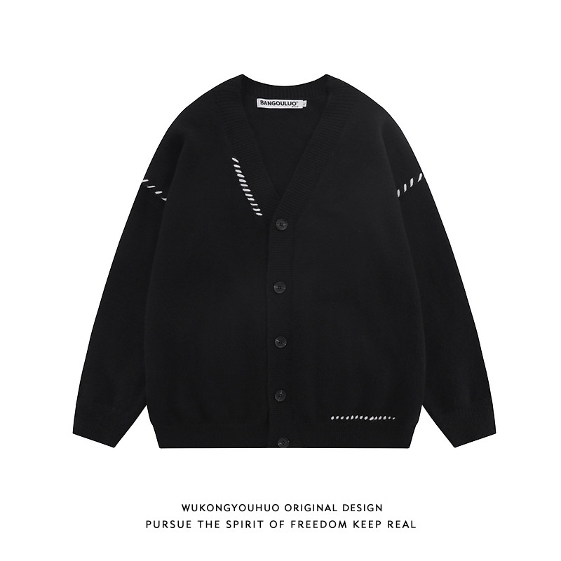 悟空有货黑白明线开衫毛衣外套男慵懒宽松V领针织衫情侣休闲线衣