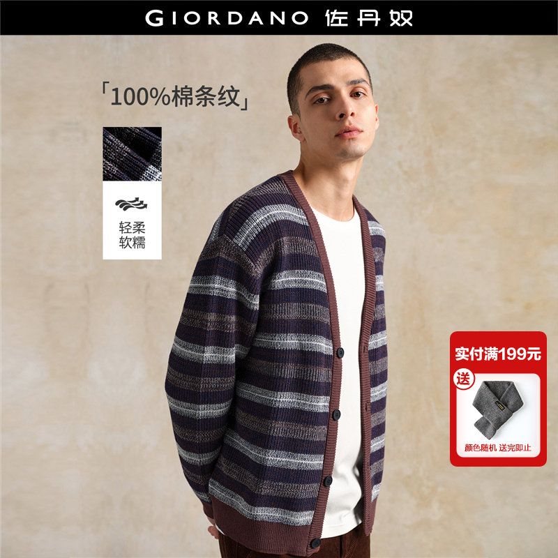 设计师款佐丹奴厚实毛衣男纯棉撞色条纹宽松V领针织开衫18055826
