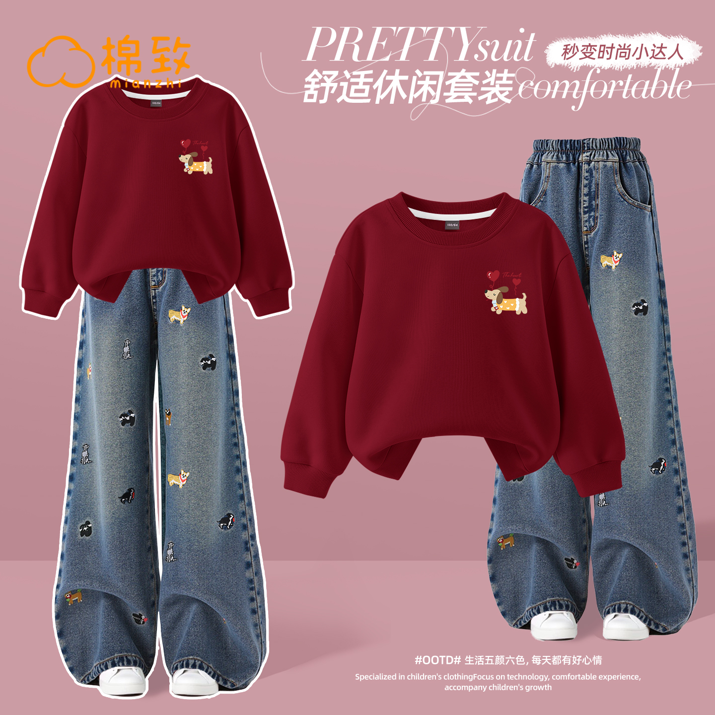 拉夏贝尔女童冬套装2025新款加绒卫衣牛仔裤大童女装运动儿童冬装