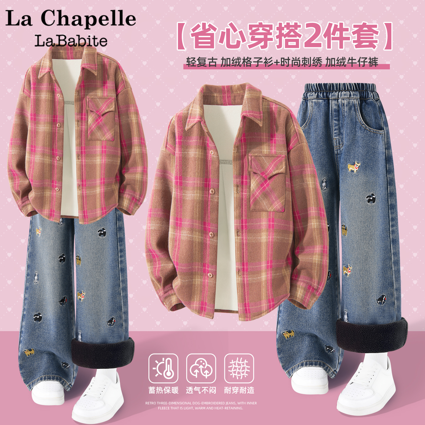 拉夏贝尔女童冬套装2025新款加绒衬衫外套大童女装牛仔裤儿童冬装
