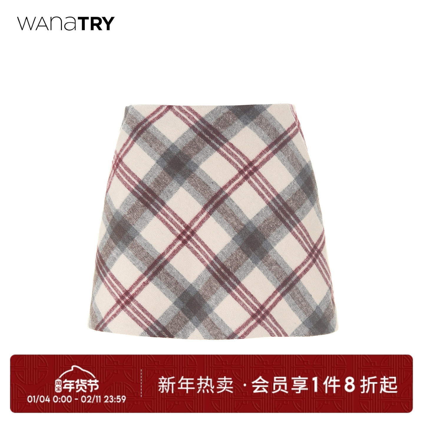 wana try绵羊毛A字半身裙节日感格纹带兜米白色裙子新款女装短裙