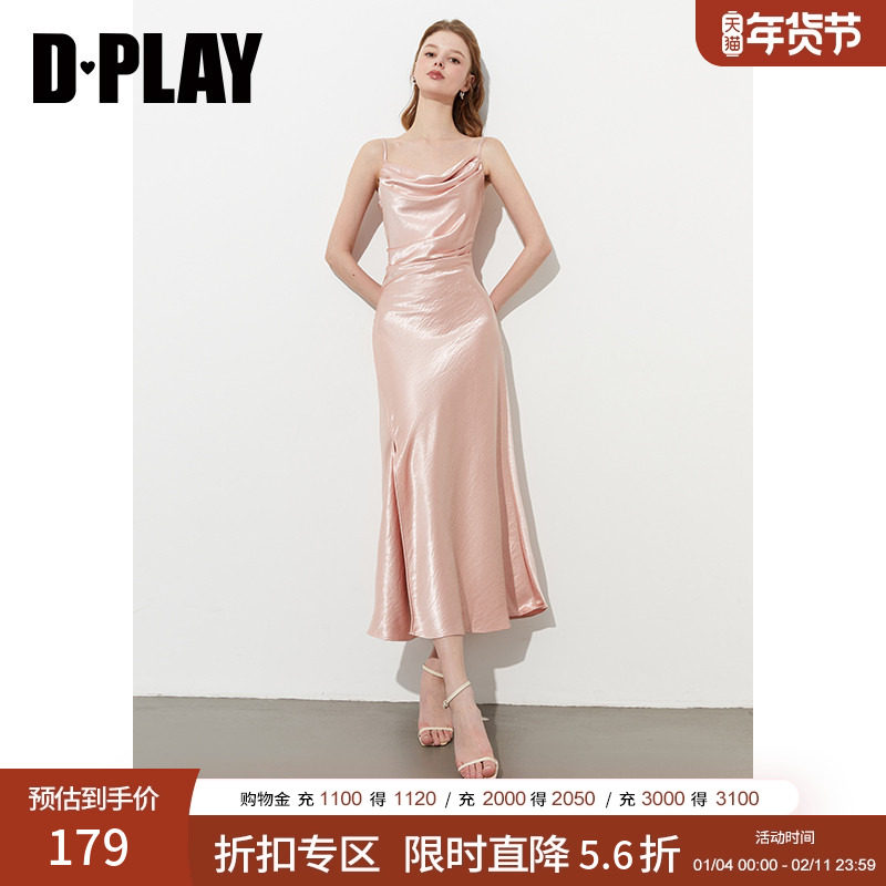 DPLAY2025年夏季新款粉色度假吊带连衣裙女法式缎面长款礼服裙子