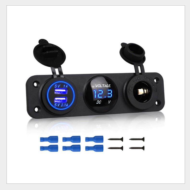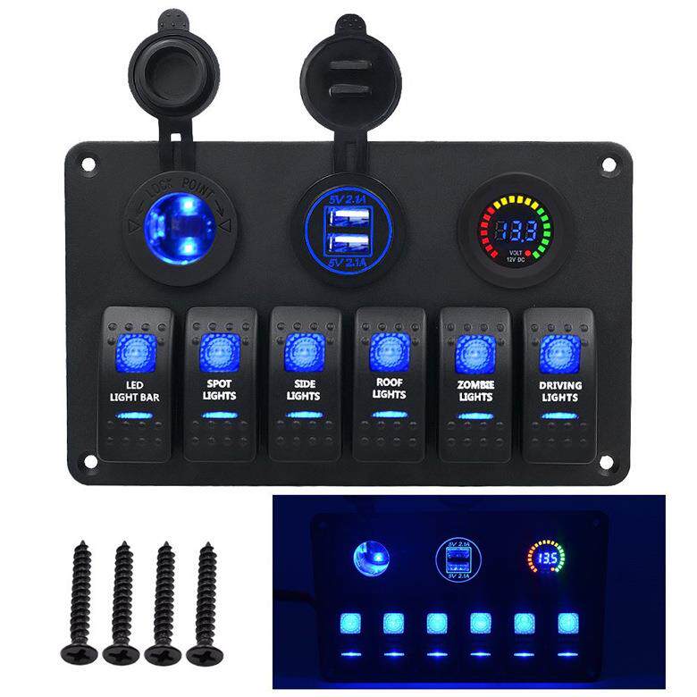 新款汽车房车改装6位方形面板双USB充电器电压表电源母座开关蓝色