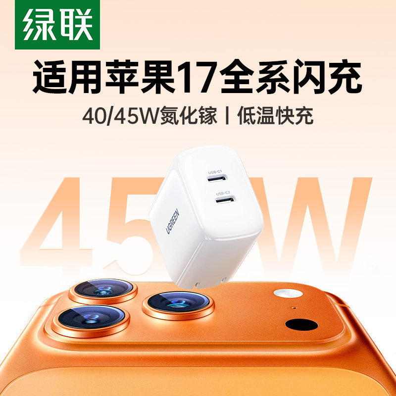【17新闪充】绿联45W氮化镓40W充电头适用苹果17Promax手机pd快充插头usb-c双口typec多孔iPhone16pro充电器