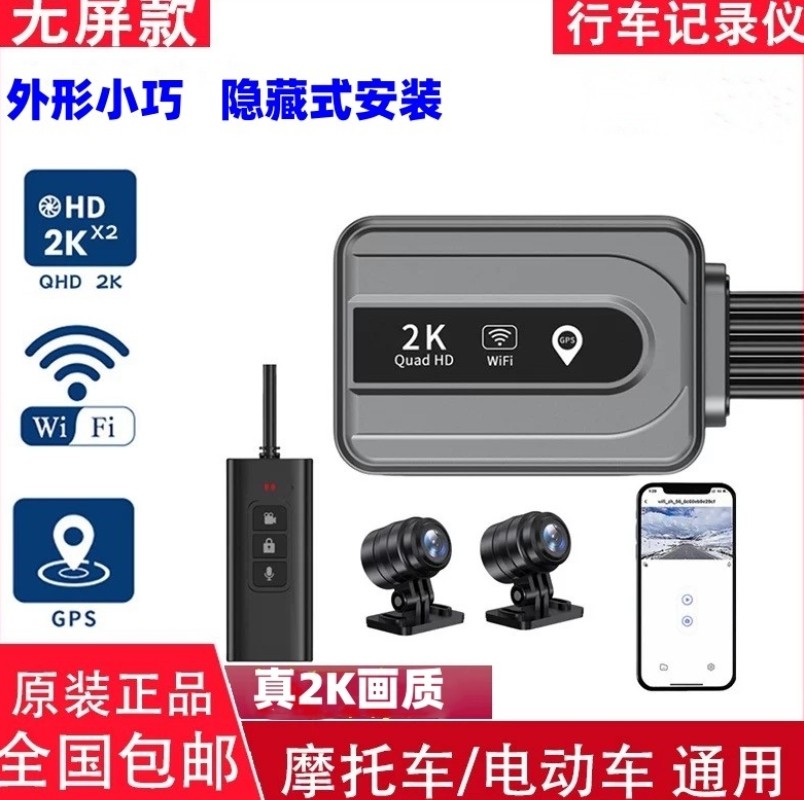 无屏摩托车行车记录仪前后双镜头高清2K无屏式带停车监控GPS