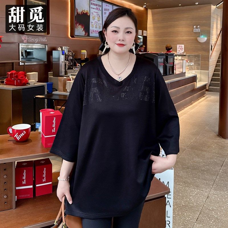 甜觅特大码女装2025春装胖mm300斤字母烫钻宽松显瘦V领长款T恤