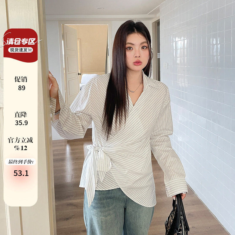 大码女装春装韩系翻领条纹衬衫交叉新款胖mm独特系带别致收腰上衣