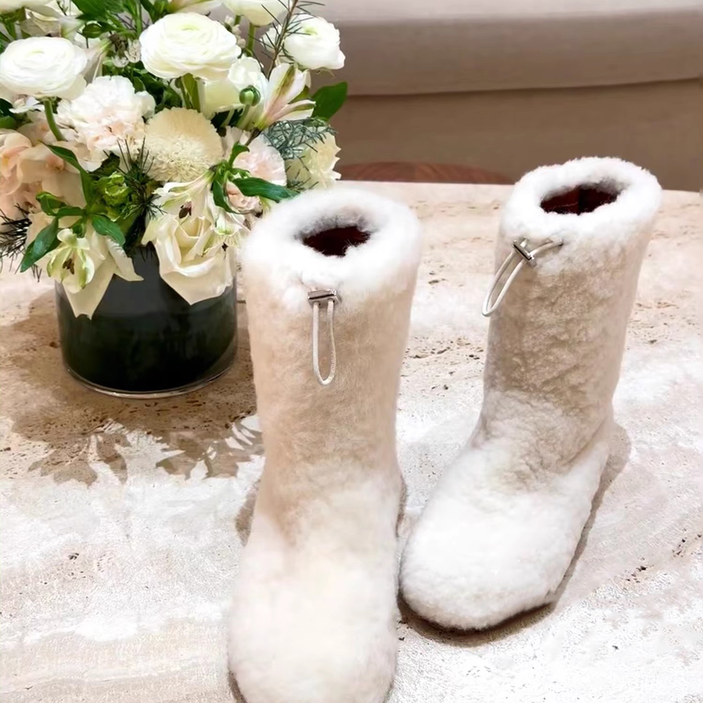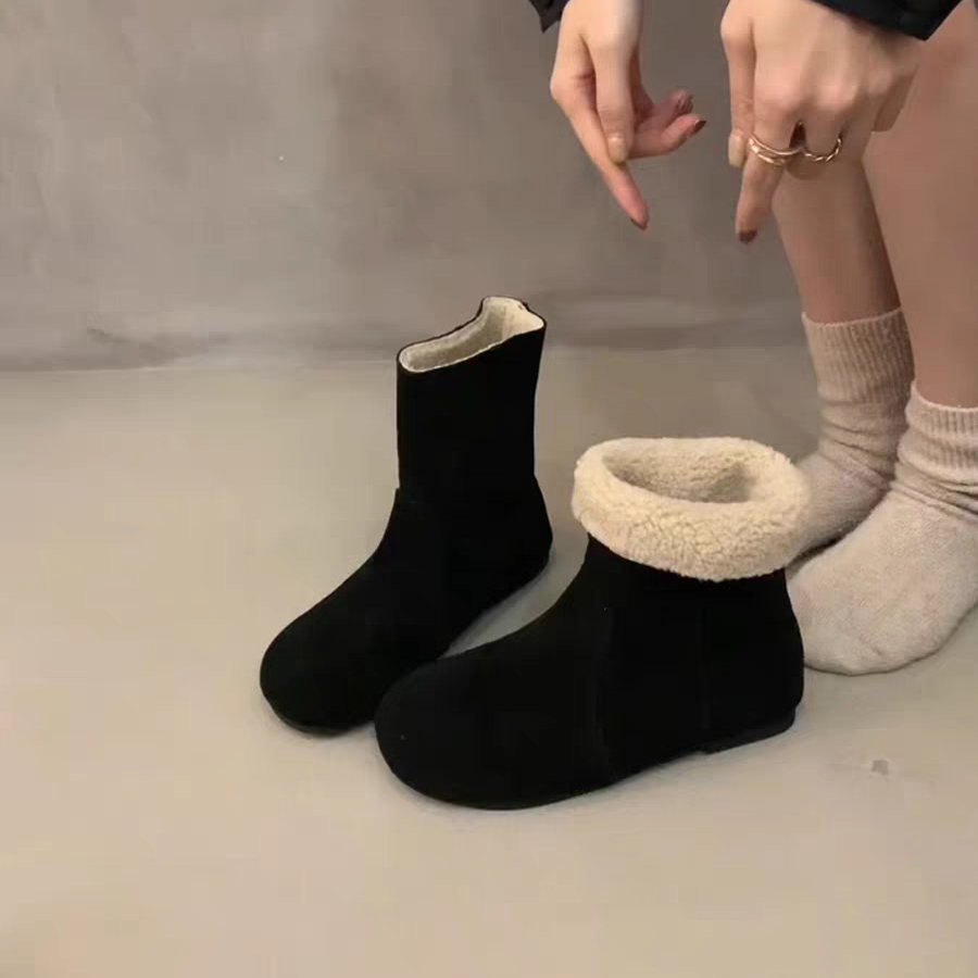 小池在首尔2025年冬季韩版可爱圆头平底毛毛鞋加绒套筒棉靴女短靴