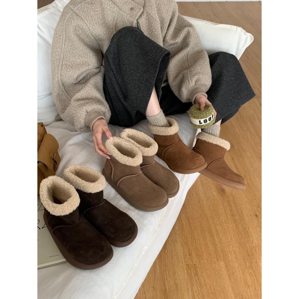 2025冬季复古加绒短筒雪地靴勃肯靴女保暖丑萌圆头毛毛靴平底棉靴