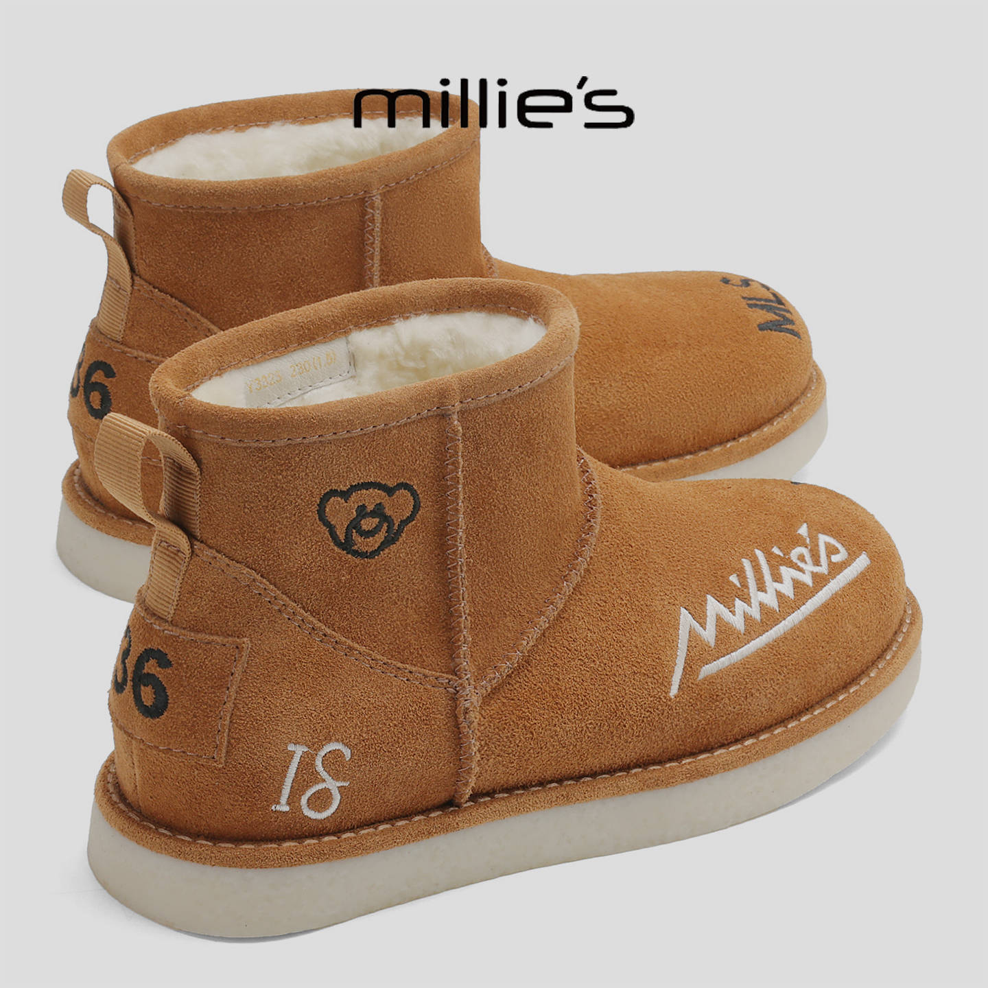 MILLIE'S/妙丽2025新款冬季保暖雪地靴加绒加厚字母刺绣平底棉靴
