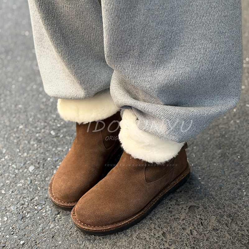 真皮羊京绒新款平底棉靴女冬季圆头日系套脚加绒保暖短靴9912-1