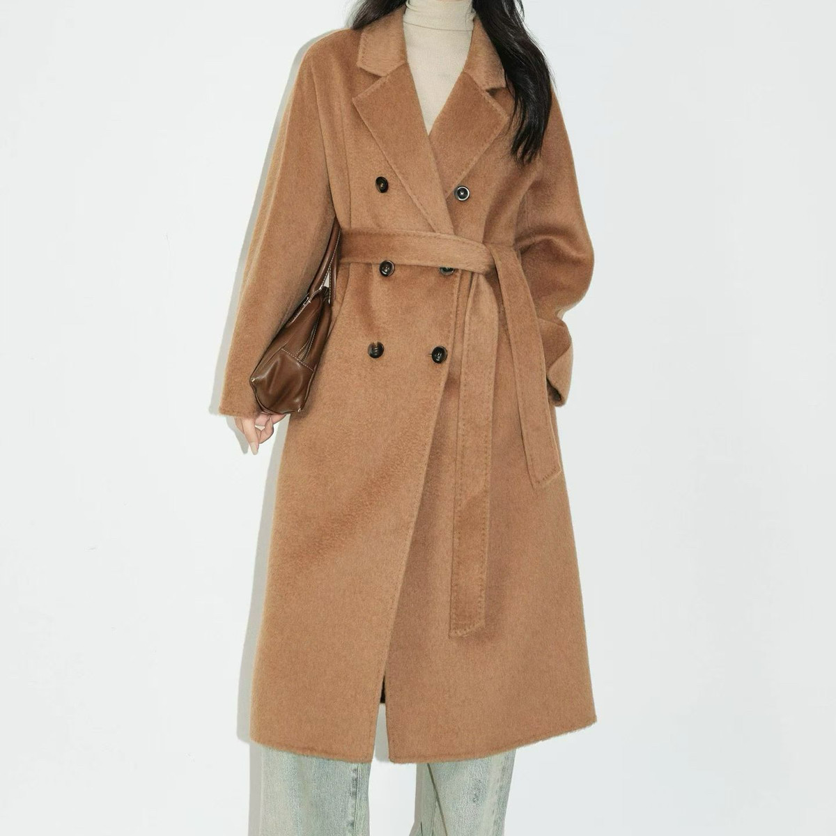 米米法式复古赫本风收腰长款大衣(配腰带)(含100骆驼绒)TRR80