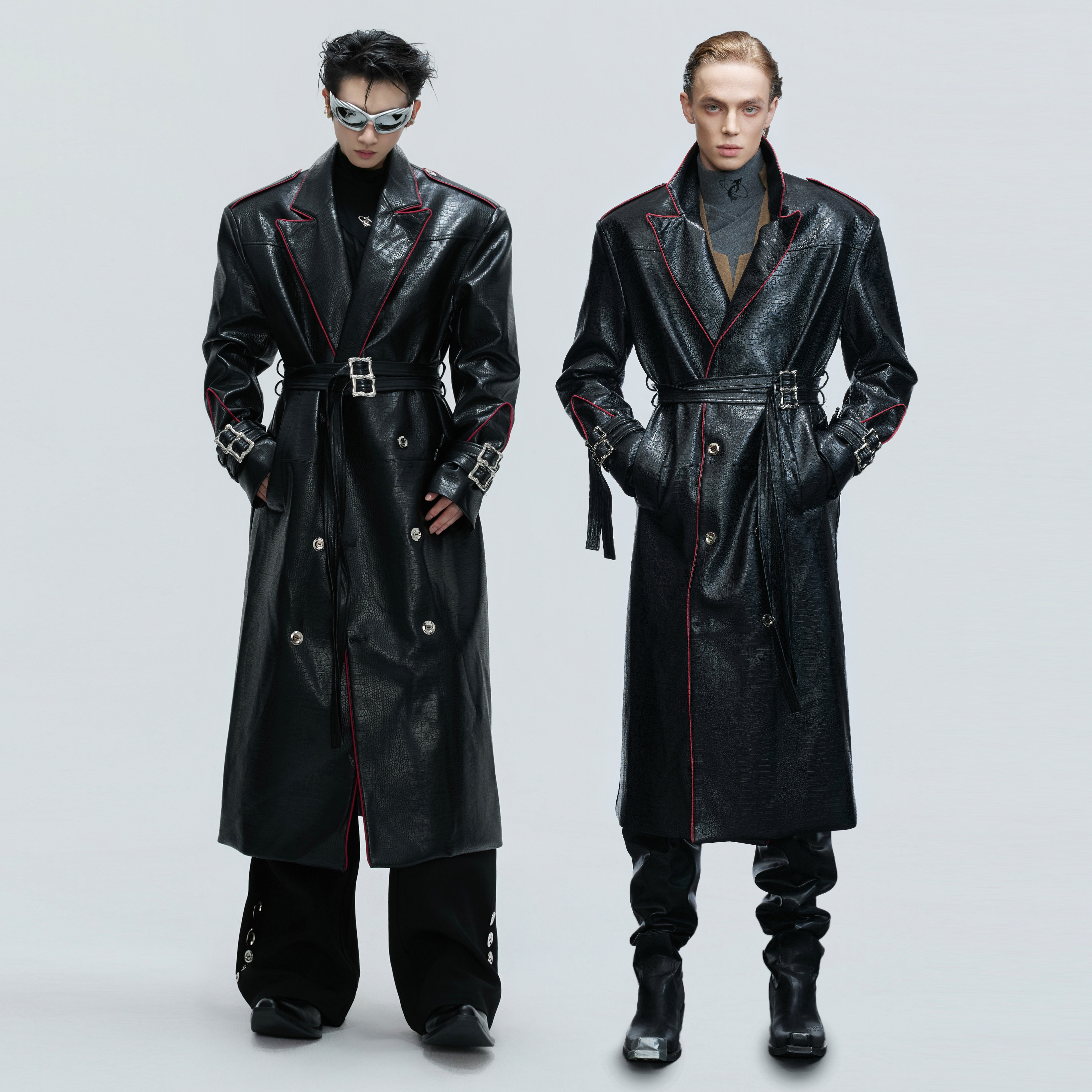 ArguE CulturE重磅解构鳄鱼纹宽肩皮大衣金属皮带收腰长款大衣