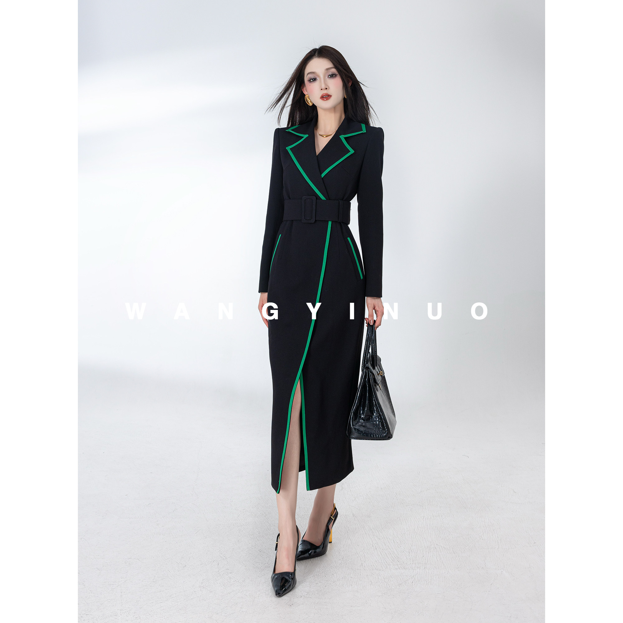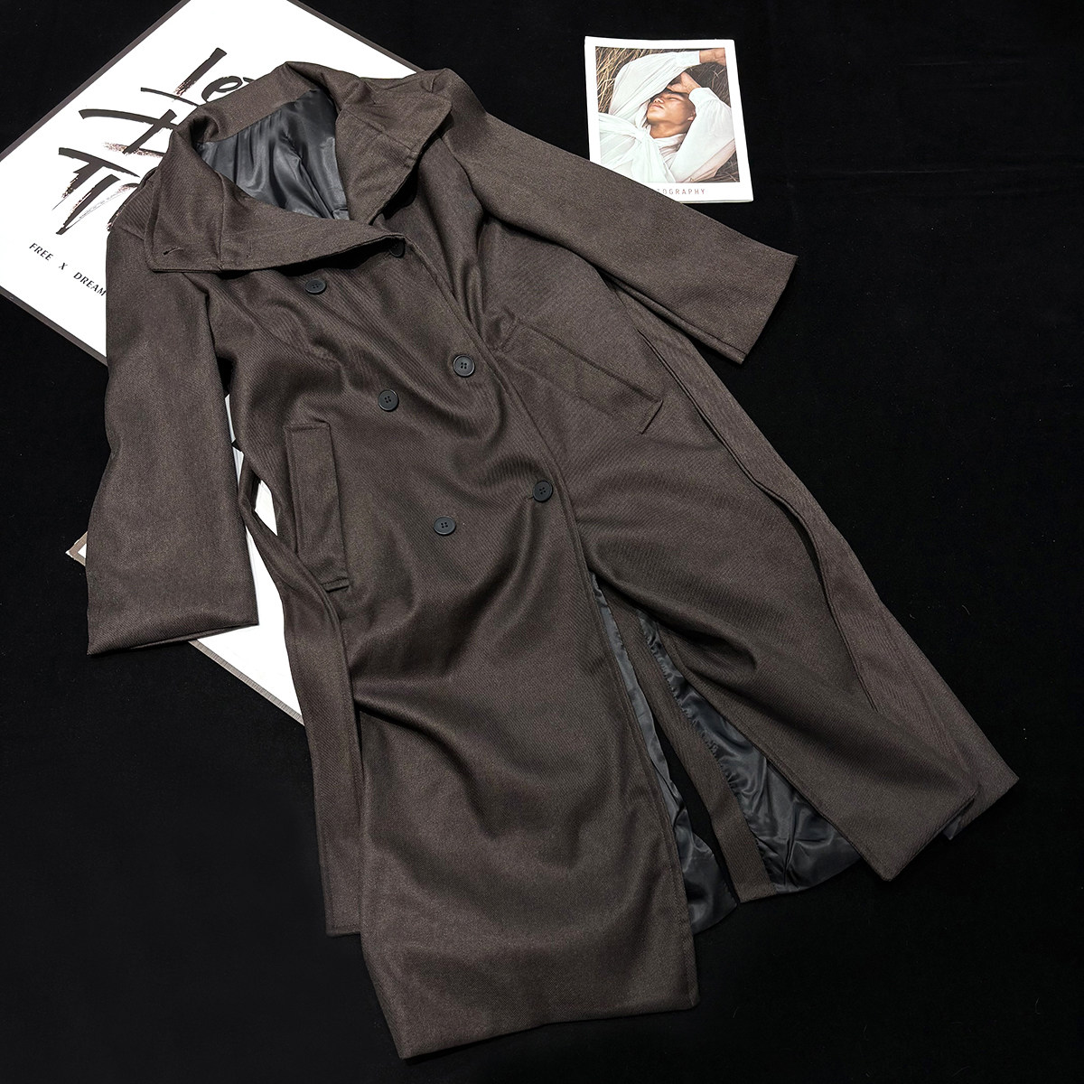 ins博主款北欧极简风翻领腰带收腰长款大衣外套双排扣后开叉风衣
