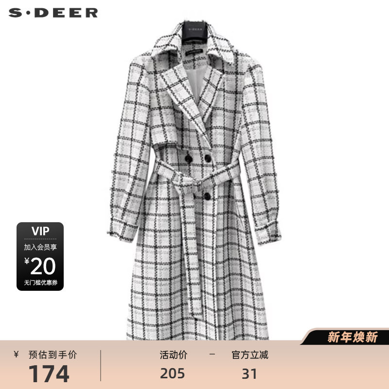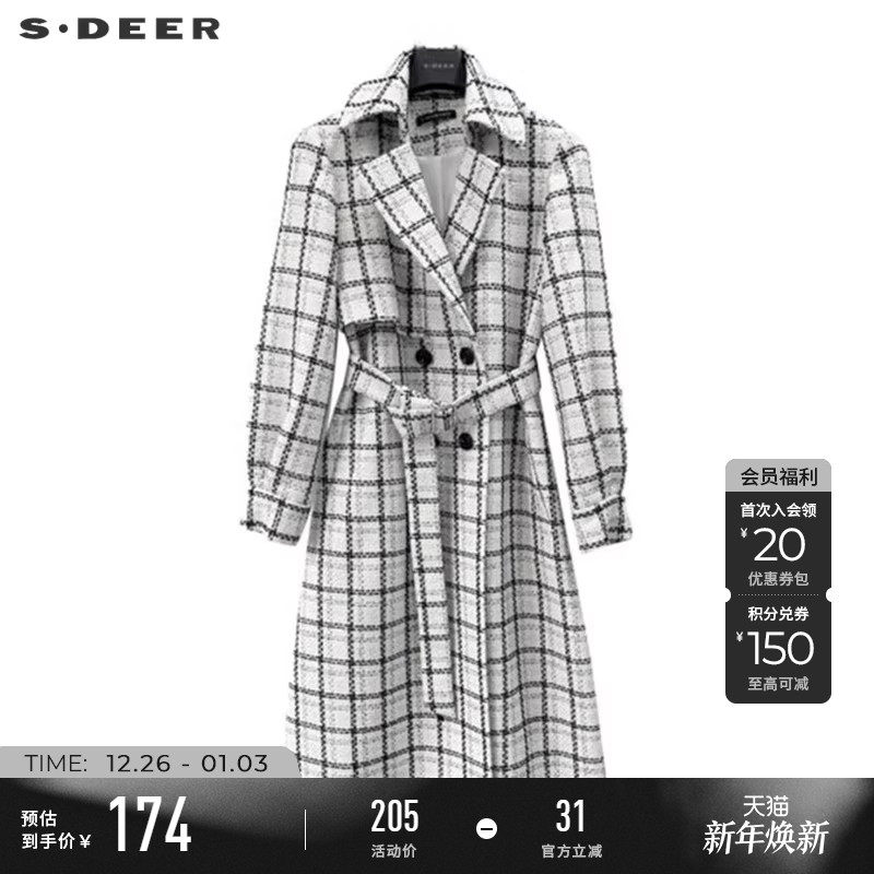 sdeer圣迪奥女装英伦风翻领格纹收腰长款大衣S223Z1858