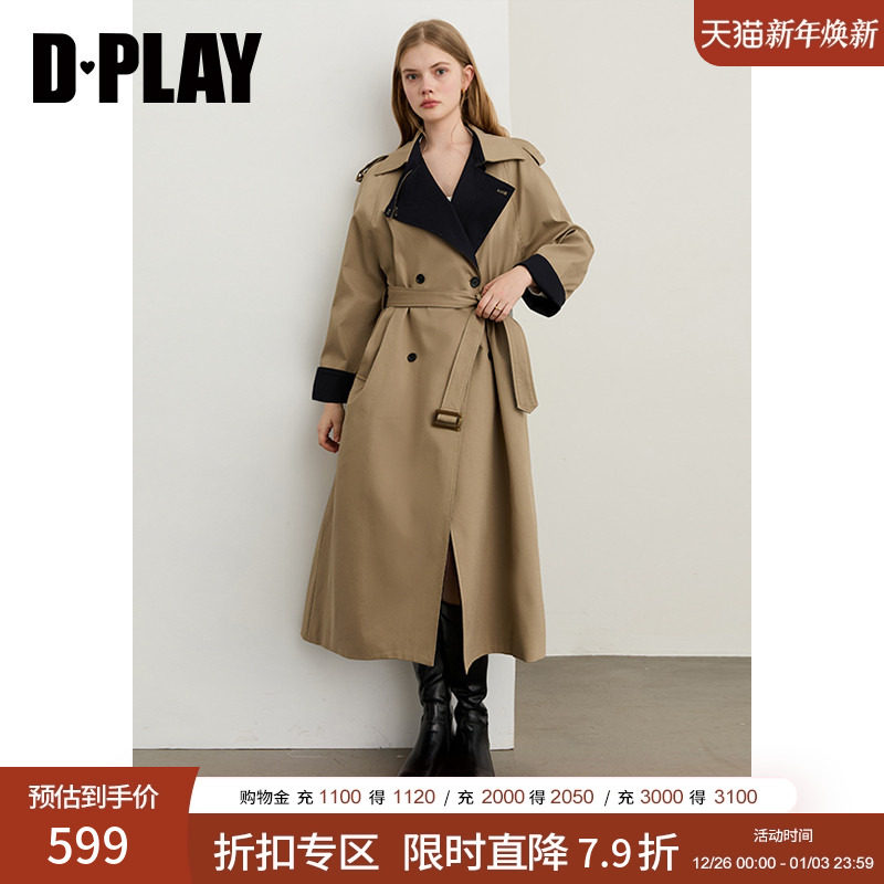 DPLAY2025年秋季新款卡其色风衣外套女时尚含腰带收腰长款大衣