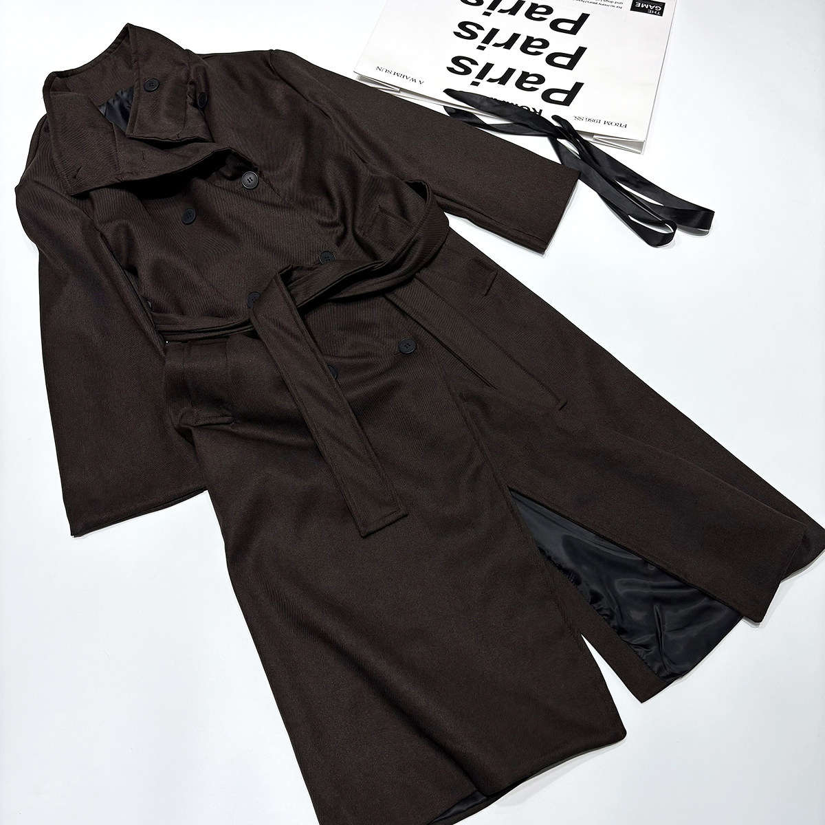 CCA自制北欧极简风翻领腰带收腰长款大衣外套双排扣后开叉风衣女