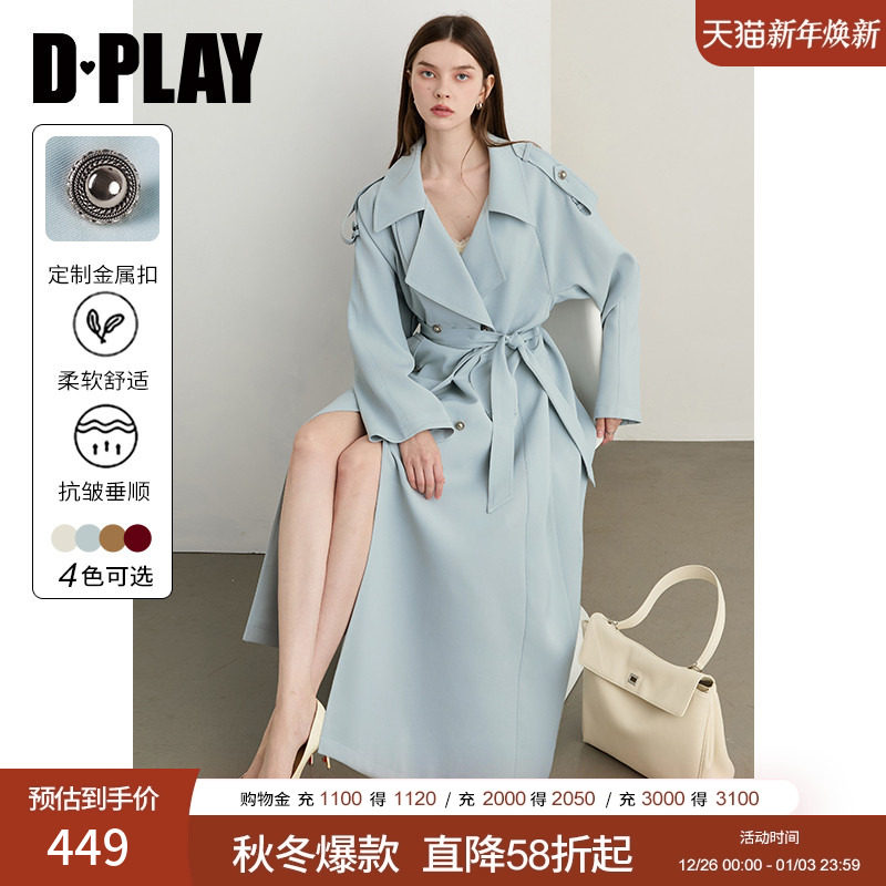 DPLAY2026年春季新款蓝色风衣外套女休闲时尚气质收腰长款大衣