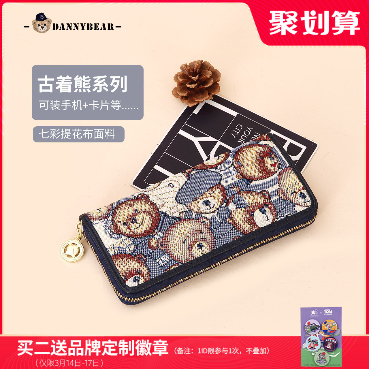 丹尼熊单拉链钱包长款女多卡位钱夹轻薄精致小熊针织钱包3822010