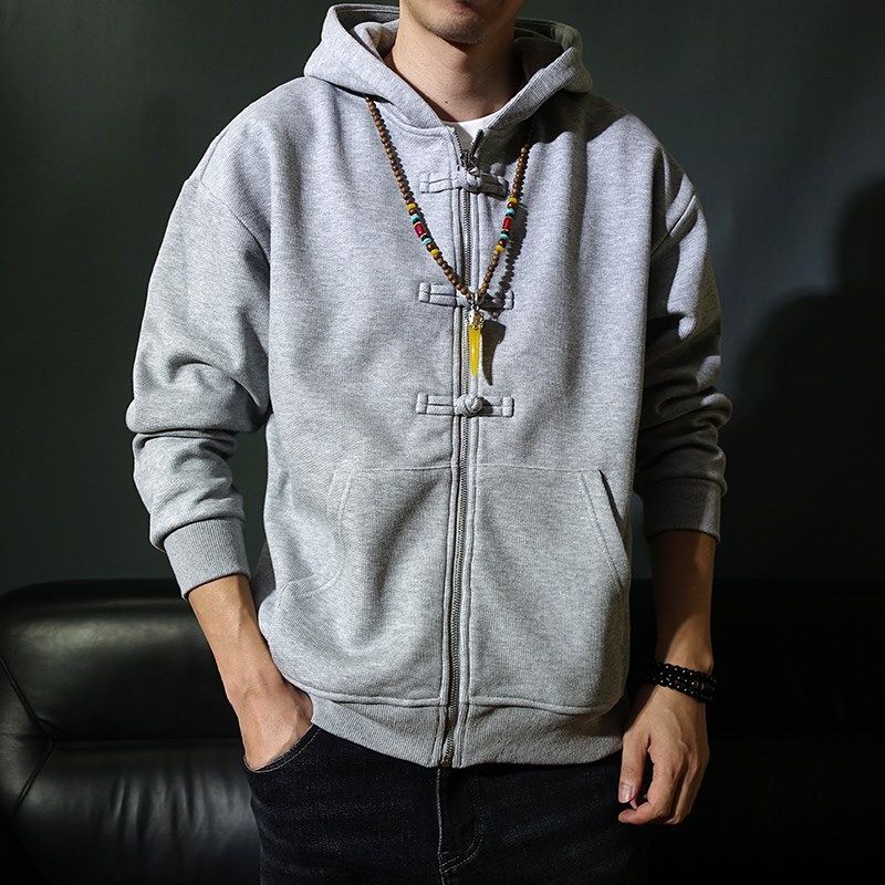 连帽开衫男子秋冬款唐装中国风盘扣抓绒保暖休闲宽松卫衣外套茶服