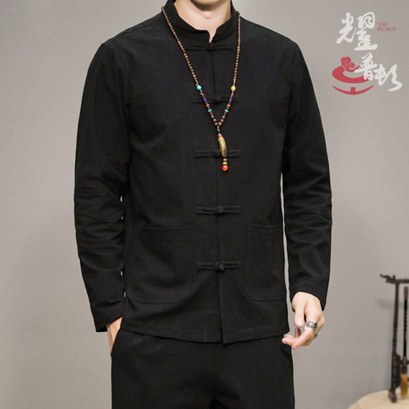 秋冬季唐装长袖衬衫中山装爸爸装宽松大码立领盘扣中国风汉服男子