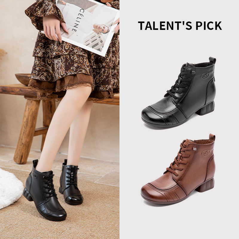 - 真皮粗跟短靴女系带马丁靴