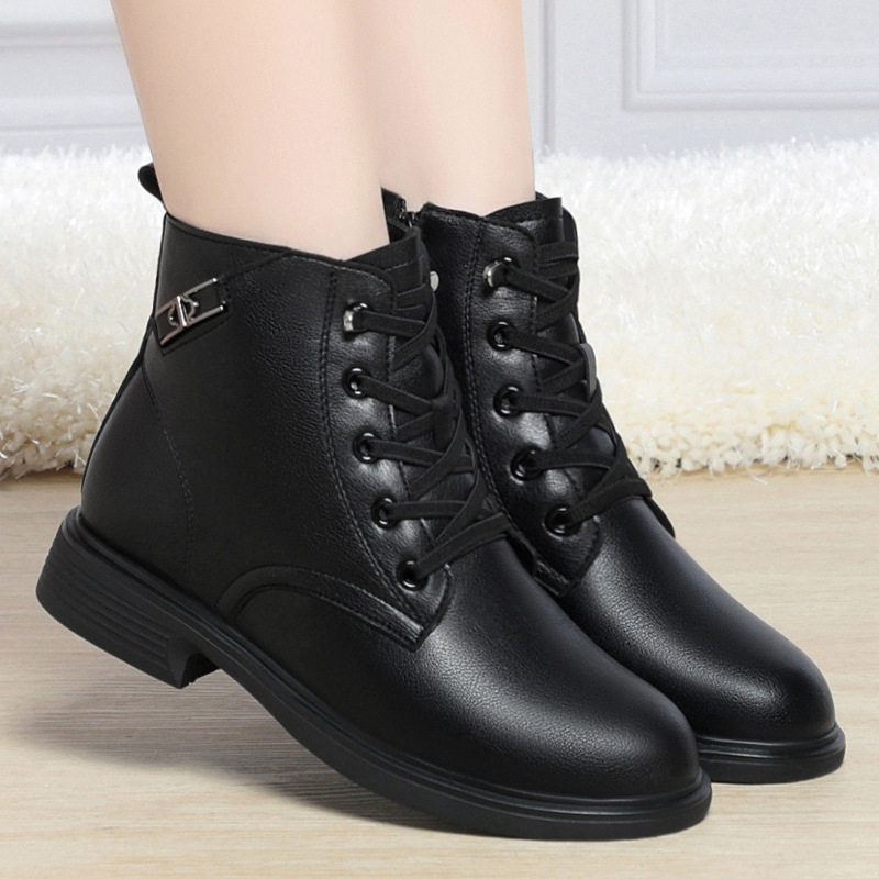 2025秋冬新款牛皮短靴女系带马丁靴中老年妈妈靴裸靴保暖防滑女鞋