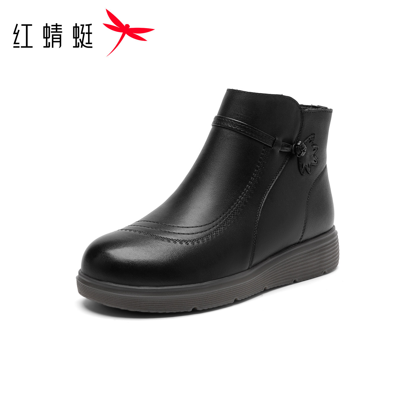 红蜻蜓妈妈鞋冬季靴鞋女士皮鞋加绒保暖鞋子中老年人防滑真皮女鞋